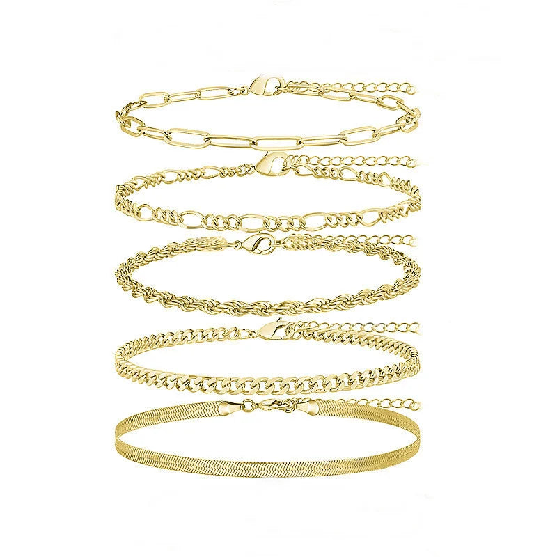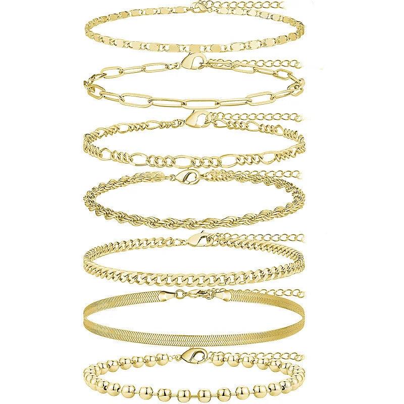 【5Pcs GOLD ANKLETS SET】:👜 Set contains: ① Cuban link anklet ② Figaro anklet ③Herringbone anklet ④Mariner Anklet ⑤Rope Anklet. These anklets are suitable for layering as well as being worn alone.